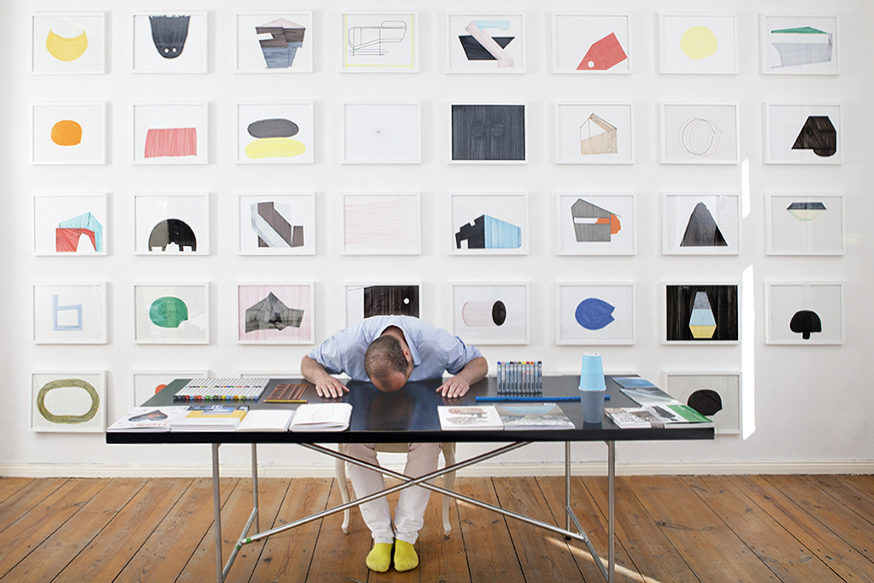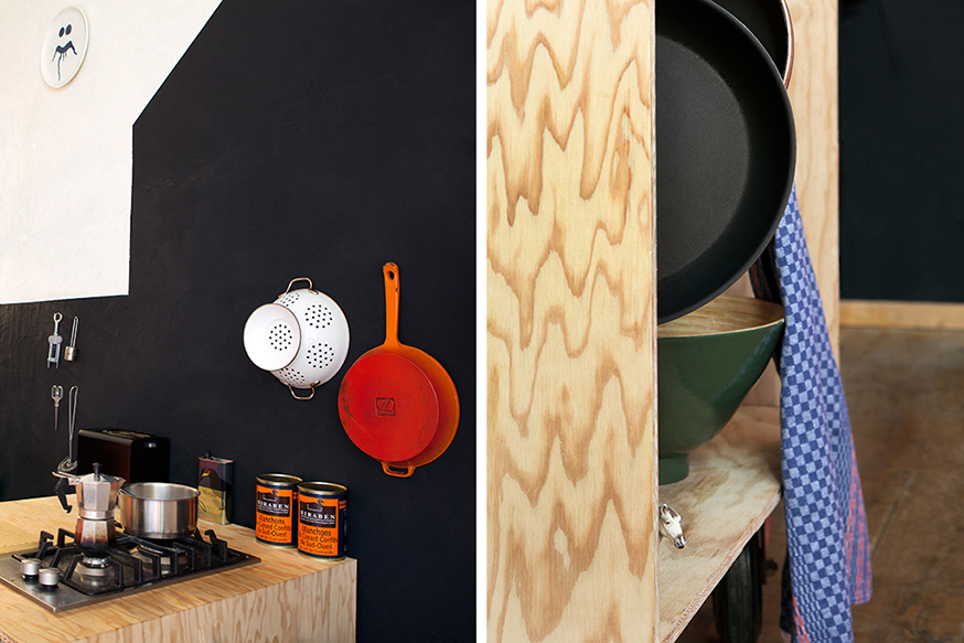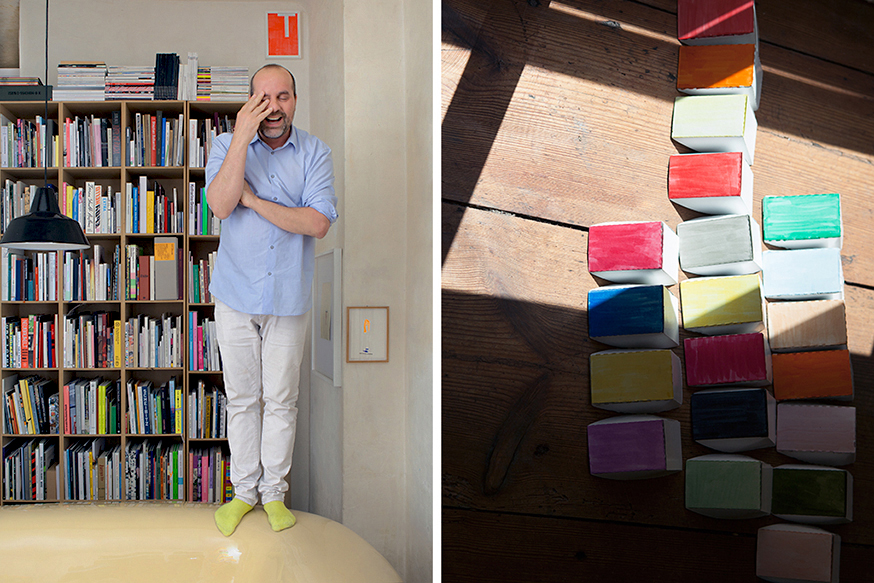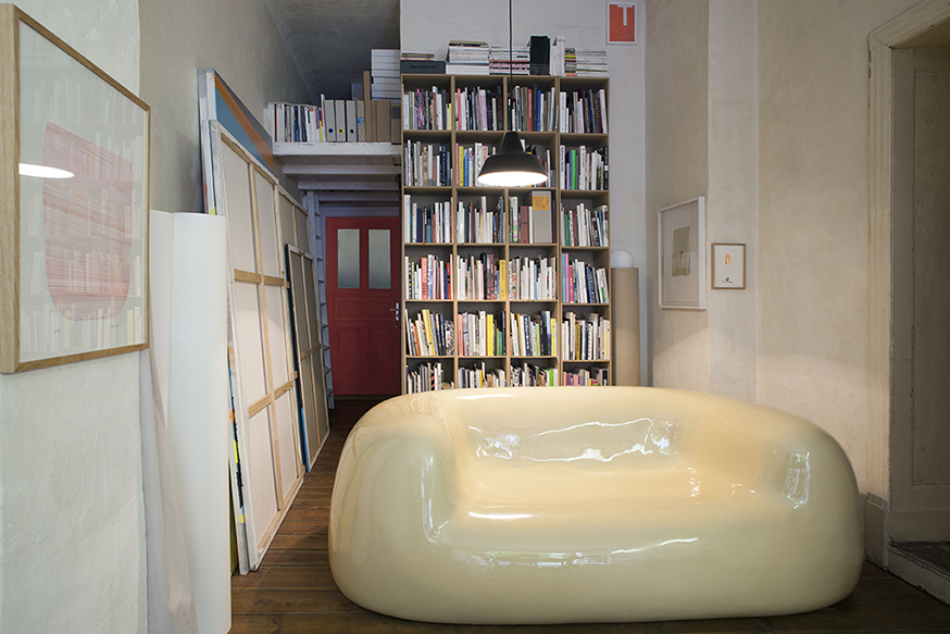 Er lebt hier umgeben von seiner eigenen Kunst und einigen ausgesuchten Möbeln, wie das Sofa aus Polyester des Kölner Künstlers Matti Braun.