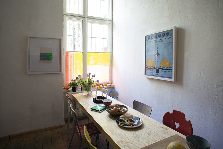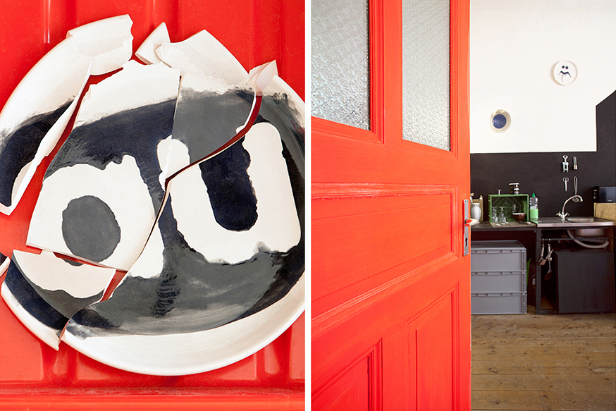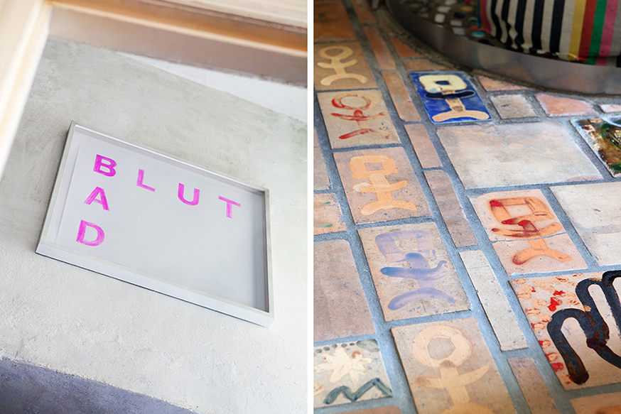 I follow Frank in his yellow socks through the neon colored door into the kitchen and the bathroom. This is a bit reminiscent of a holiday in the South. A potter let off steam here and tiled the floor with hand-painted earthenware. Now, Frank has set up a bloodbath here. At least in words, because typography always plays a central role in his paintings.