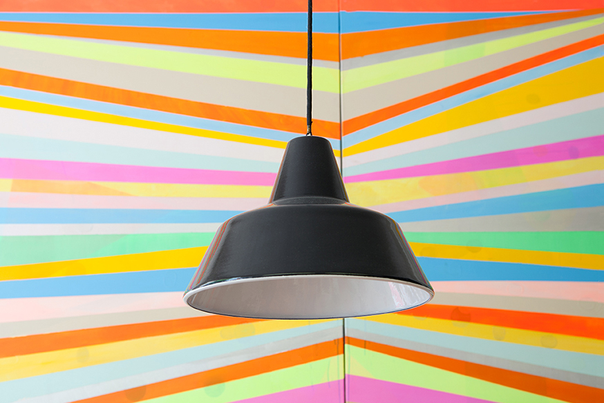 Ich folge Frank auf seinen gelben Socken bis durch die neonfarbene Türe in die Küche und das Bad. Dieses erinnert ein bisschen an einen Urlaub im Süden. Hier hat sich vor ihm ein Keramiker ausgetobt und den Boden mit handbemaltem Terrakotta gefliest. Jetzt hat Frank hier ein Blutbad eingerichtet. Zumindest mit Worten, denn Typografie spielt in seinen Bildern immer wieder eine zentrale Rolle.