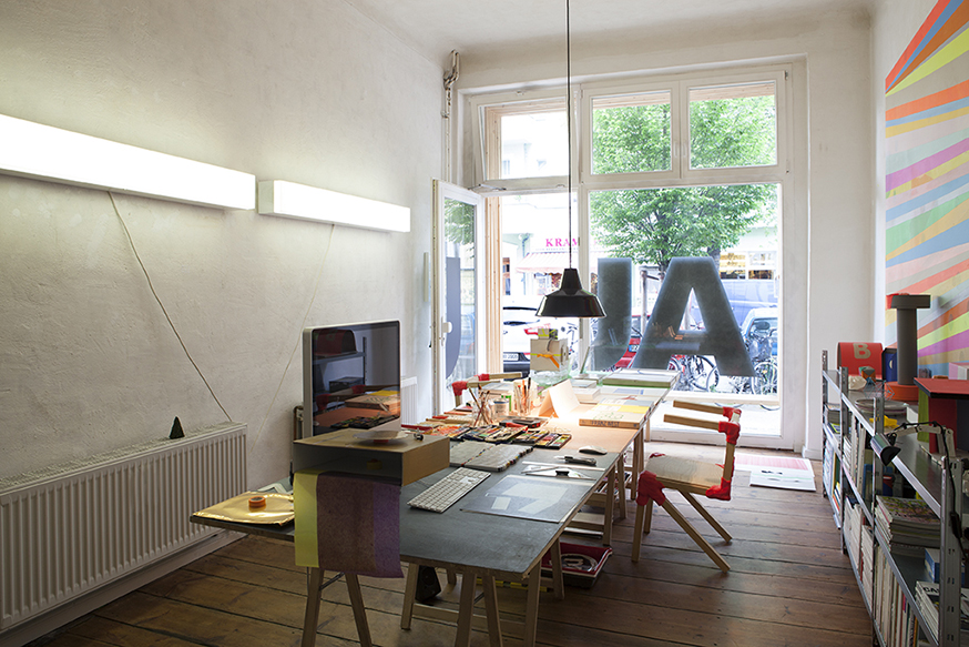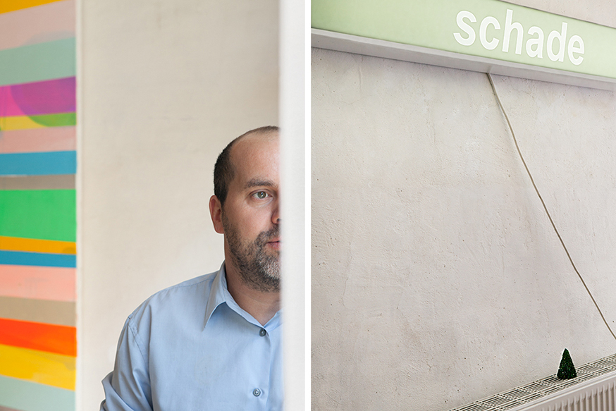 Also, those who press their nose against the front slice, finds no display of goods. But perhaps you can see Frank sitting at his desk, because this former shop is his home. Frank does not distinguish between living, working and exhibition space. He lives here surrounded by his own art and some selected furniture, such as the sofa made of polyester by the Cologne artist Matti Braun.