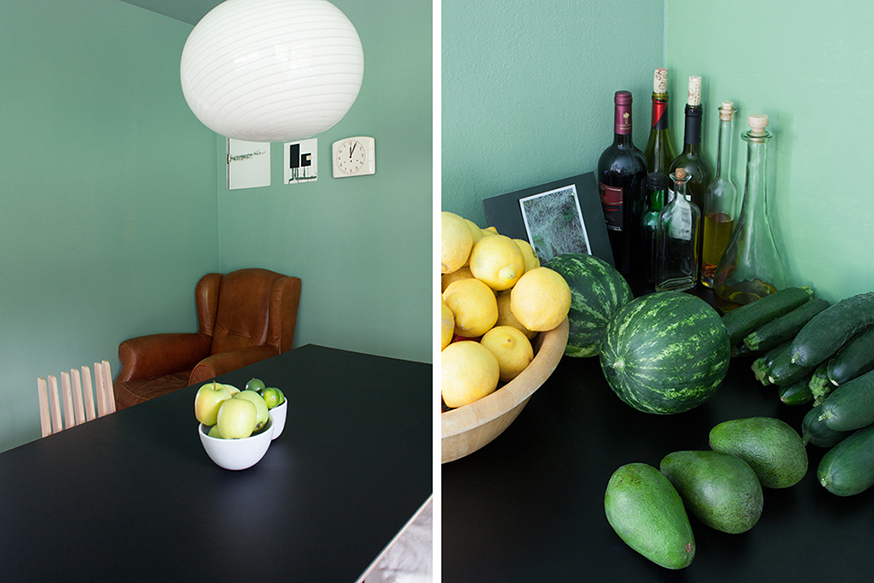 The view through the green kitchen, with the fruit and vegetables sorted by colour, leads directly into the garden. There, on a large stone slab, the grilled courgettes are fragrant pictures