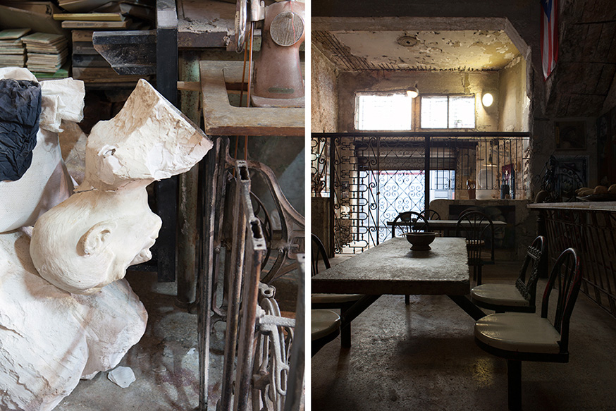 His studio is also living space, and it’s a chamber of wonders filled with rarities, curiosities, stuffed with Cuban history and of course his stone and wood sculptures. They stand there, between all his collectibles.