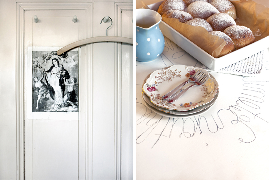 The community brought this 200-year old house back to life and it is written directly into ‘the happy greyness’:`Tu deviens responsable pour toujours de ce que tu as apprivoisé´ (you are responsible for what you have familiarized yourself with). Love for old things is everywhere and everything is mixed with a little Pippi Longstocking. You know: “I create my world diddle diddle as I like it…” Finally, we sit at the kitchen table with coffee, pastries and prosecco. Written on the table is : “Take time to enjoy the simple things in your life.” Exactly!